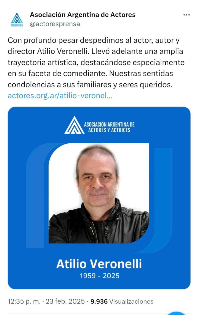 El actor Atilio Veronelli murió a los 65 años. Así lo informó la Asociación Argentina de Actores este domingo por la mañana.
