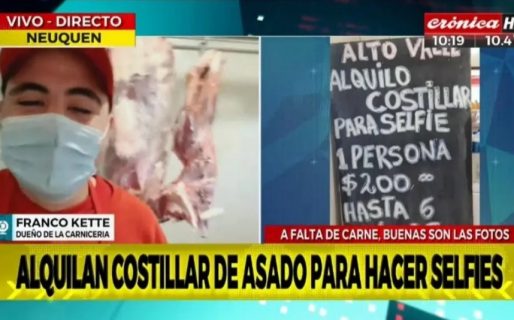 «Alquilo costillar para selfie», dice uno de los carteles que se viralizó a través de las redes sociales. Crónica HD habló en exclusiva con Franco Kette, dueño del comercio, quien pensó todo para «sacarle una sonrisa a la gente». Franco es de Comodoro Rivadavia, y hace 6 años que está en Neuquén, con la carnicería hace 4 años que trabaja.