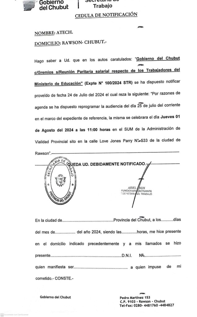 En este sentido, desde la Asociación de Trabajadores de la educación de Chubut, recordaron que la audiencia comprometida para el 18 de julio había sido postergada para mañana jueves al 25.