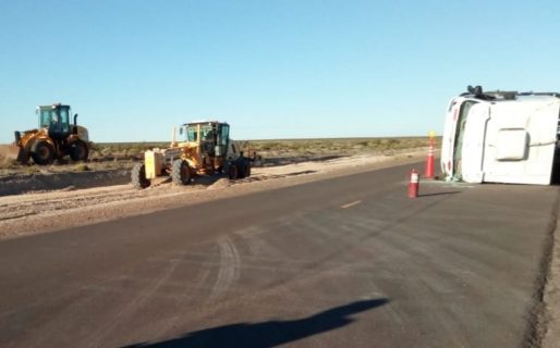 Marcelo Yapura de Vialidad Nacional informó que luego del vuelco del camión que transportaba carga peligrosa, maquinaria del organismo nacional, construyó un desvío en el Km. 1696 de la Ruta N°3, ya que el vehículo permanece en la ruta y ocupa media calzada. Este domingo llegarán equipos especiales para retirarlo.
