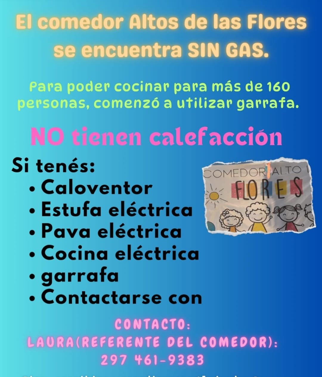 Cualquier persona interesada en colaborar puede comunicarse al 2974619383 (Laura) o acercarse al comedor.