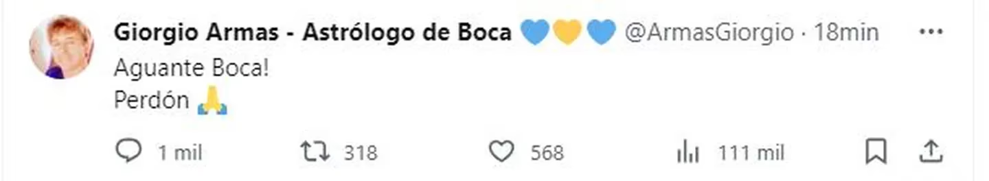 Tras el partido los hinchas de Boca le pidieron explicaciones en las redes sociales y el astrólogo solo pidió disculpas: “Aguante Boca. Perdón”.