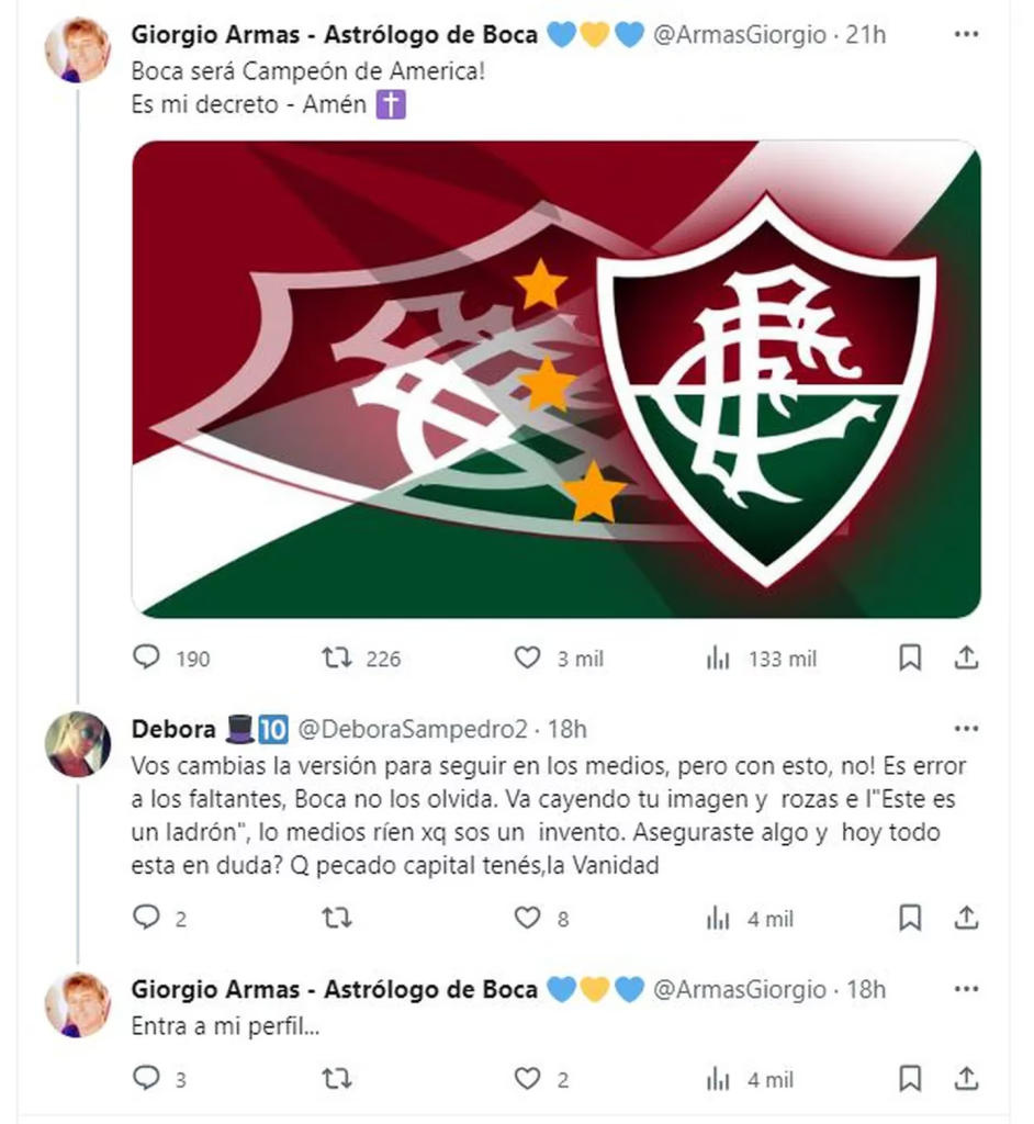 A fines de octubre, Giorgio Armas había asegurado que el Xeneize iba a salir campeón de la Copa Libertadores. “Será campeón, es mi decreto”, publicó en sus redes, para alegría de los hinchas del Xeneize en su momento. Alegría que no fue tal.