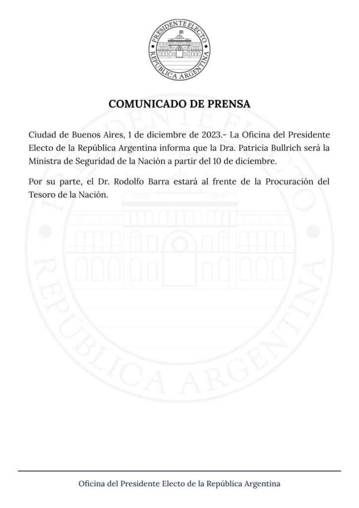 “La Oficina del Presidente Electo de la República Argentina informa que la Dra Patricia Bullrich será la Ministra de Seguridad de la Nación a partir del 10 de diciembre”, informó el comunicado. “Por su parte, el Dr Rodolfo Barra estará al frente de la Procuración del Tesoro de la Nación”, añadió.