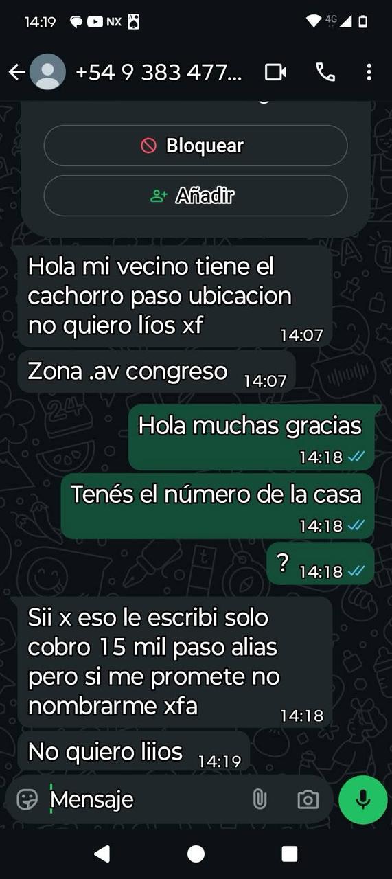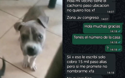La denuncia indica que el individuo pedía un total de 15 mil pesos para revelar el lugar donde supuestamente había visto al perro, solicitando 7 mil por adelantado y el resto al momento del encuentro. “Nos escribió una persona, cobrándome para decirme dónde vio a nuestro perrito… Qué indignante”, expresó la dueña en su publicación, que rápidamente generó repudio entre los usuarios de la red social.