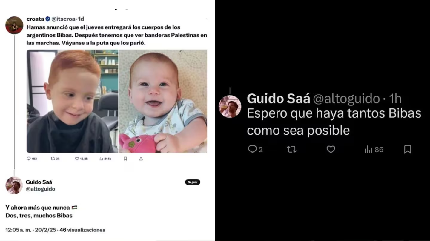 “Ahora más que nunca, muchos Bibas”, dice otra de las publicaciones realizadas desde la cuenta @altoguido, en referencia a la familia argentina asesinada por el grupo terrorista Hamas. Los comentarios antisemitas ganaron notoriedad rápidamente en la red social y provocaron un fuerte rechazo en la comunidad educativa.