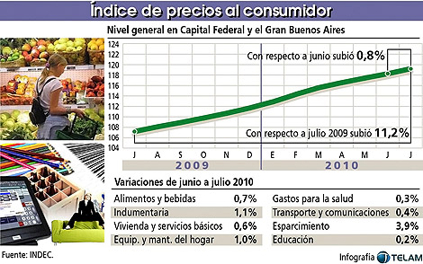El Indice de Precios al Consumidor (IPC-Costo de Vida) registró durante julio una suba del 0,8 por ciento en comparación a junio, impulsado por los gastos de las vacaciones de invierno, el alza en Indumentaria, junto con Alimentos y Bebidas, informó hoy el Instituto Nacional de Estadística y Censos (INDEC).