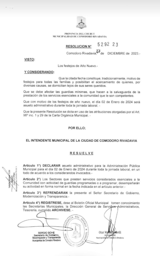 El Intendente de Comodoro Rivadavia, Othar Macharashvili, a través de la Resolución N° 529223, decretó asueto para todos los empleados municipales el próximo martes 2 de enero.