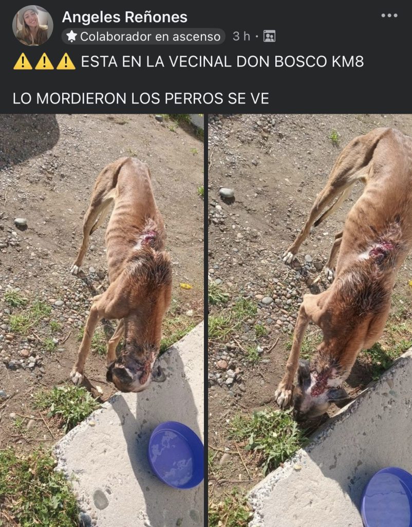 Un perro en muy mal estado apareció en la vecinal del barrio Don Bosco, en Km 8. Vecinos que lo vieron aseguran que fue mordido por otros perros y que, además, está en un estado avanzado de desnutrición.