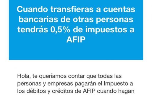 Al detallar los motivos por los que se aplicará el denominado impuesto al cheque, sancionado en 2001 como un “impuesto de emergencia” y nunca derogado, se indicó: “Para brindarte servicios, como transferir dinero a otras personas, tenemos que pagar a AFIP el impuesto que nos indique para cada caso”.
