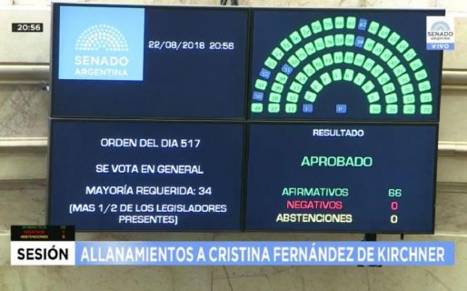 El Senado aprobó por unanimidad este miércoles en general los allanamientos a los domicilios de la ex Presidenta Cristina de Kirchner ordenados por el juez federal Claudio Bonadio, pero la votación se dividió cuando se trataron las condiciones pedidas por la senadora.