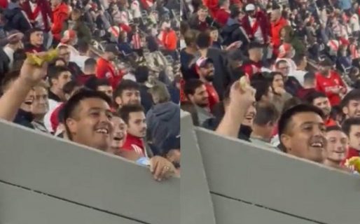 Riéndose y con un tono poco serio, el hincha comienza a cortar por pedacitos la fruta y, ya a lo último, le arroja la cáscara a la tribuna visitante que contaba con más de dos mil hinchas del conjunto brasileño.