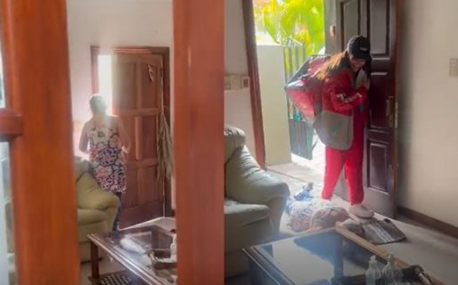En complicidad con su hermano hicieron que su madre pidiera comida por delivery así ella llegaría camuflada y la sorprendería cuando abra la puerta. El episodio iba tal cual querían, pero de la emoción ella cayó al suelo.
