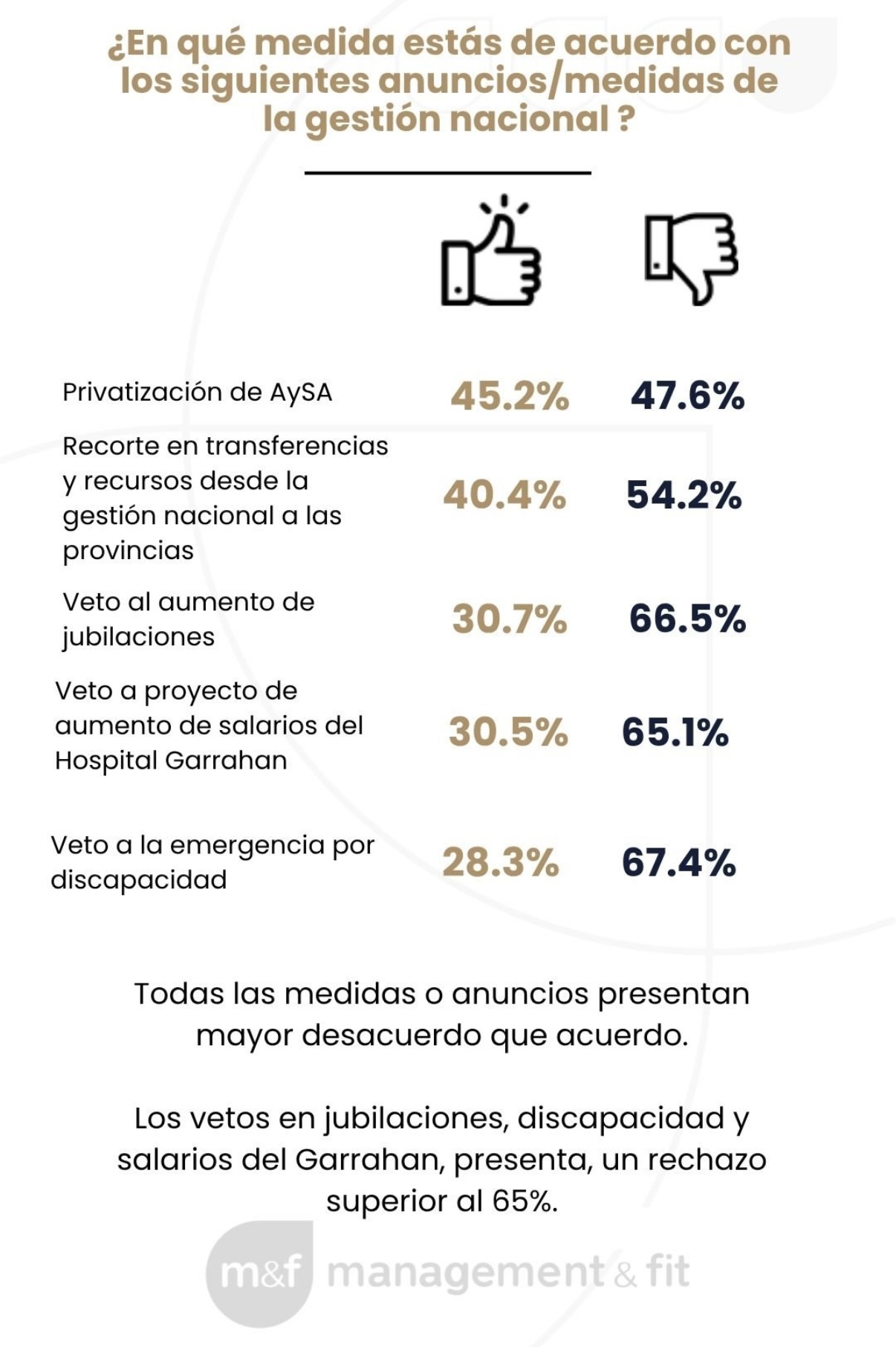 El informe también midió la opinión pública sobre anuncios y medidas recientes del Gobierno Nacional, revelando un mayor nivel de desacuerdo que de acuerdo en todos los casos. Los vetos a leyes de carácter social son los que generan un rechazo más contundente.