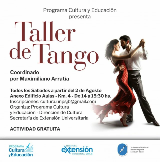 El Taller de Tango de la Universidad Nacional de la Patagonia San Juan Bosco (UNPSJB) reabrió sus puertas el pasado viernes 2 de agosto en el Anexo Edificio Aulas de Km. 4. Las clases, a cargo del instructor Maxi Arratia, se dictarán los viernes de 14:00 a 15:30 horas, con el objetivo de atraer tanto a estudiantes universitarios como a amantes de esta danza emblemática.