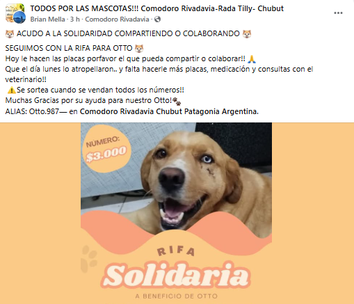El pasado lunes, Otto, un perro de la zona, fue atropellado y actualmente se encuentra en tratamiento veterinario. Su dueño informó a través de redes sociales que Otto necesita realizarse varias placas, continuar con medicación y asistir a consultas veterinarias para su recuperación.