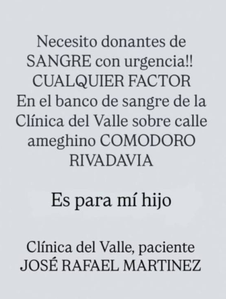 La familia de José Rafael Martínez piden colaborar con donaciones de sangre de cualquier factor sanguíneo. José Rafael se encuentra internado en la Clínica del Valle, ubicada sobre la calle Ameghino en Comodoro Rivadavia, y requiere transfusiones para continuar con su tratamiento.