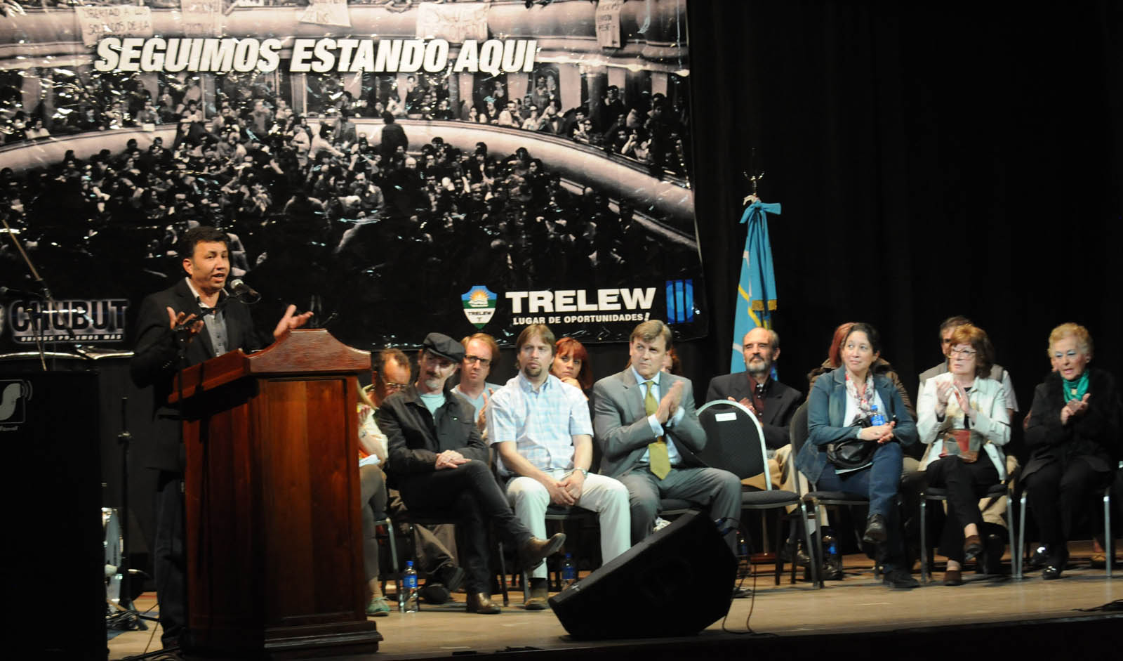 En la oportunidad hubo varios oradores, la mayoría familiares y víctimas de la represión, además del secretario de Cultura quien aseguró que la cultura es un vehículo para mantener viva la memoria. Además el subsecretario de Derechos Humanos que aseguró que todos los 11 de octubre tiene que estar el teatro lleno como en 1972 y el intendente Pérez Catán, quien entre otras cosas afirmó que Trelew debería ser, “la capital de la democracia”.