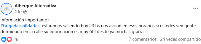 “Estaremos saliendo hoy a las 23 hs”, informaron desde la organización, e hicieron un llamado a la comunidad para colaborar informando si ven personas durmiendo en la vía pública. “Su información es muy útil”, remarcaron.
