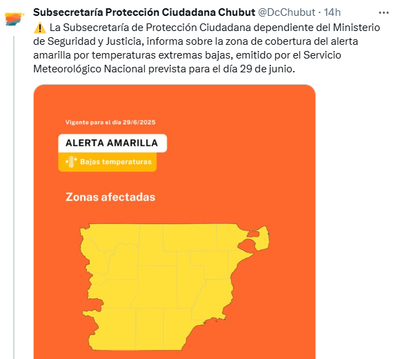 La Subsecretaría de Protección Ciudadana, dependiente del Ministerio de Seguridad y Justicia, informa que el Servicio Meteorológico Nacional ha emitido una alerta amarilla por temperaturas extremas bajas que afectará a toda la provincia del Chubut durante el día 29 de junio.