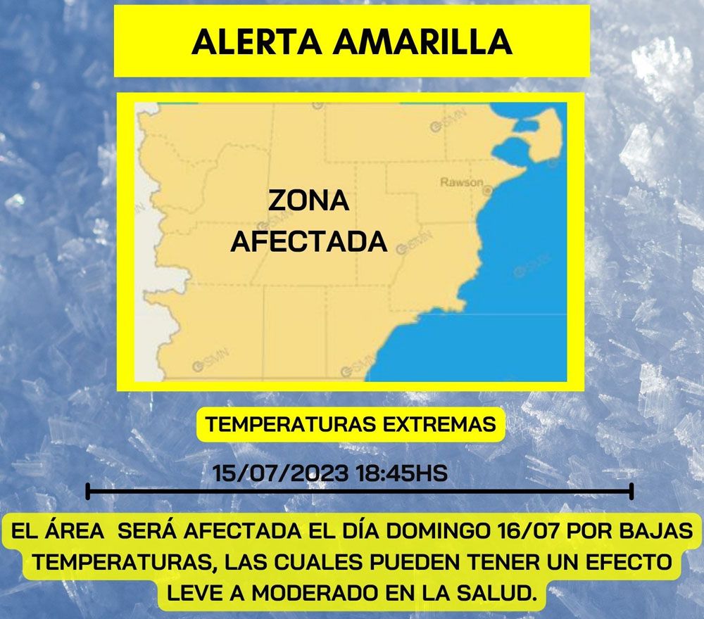 El Servicio Meteorológico Nacional (SMN) emitió una alerta amarilla para la totalidad de la Provincia del Chubut debido al pronóstico de bajas temperaturas que se prevé para este domingo.