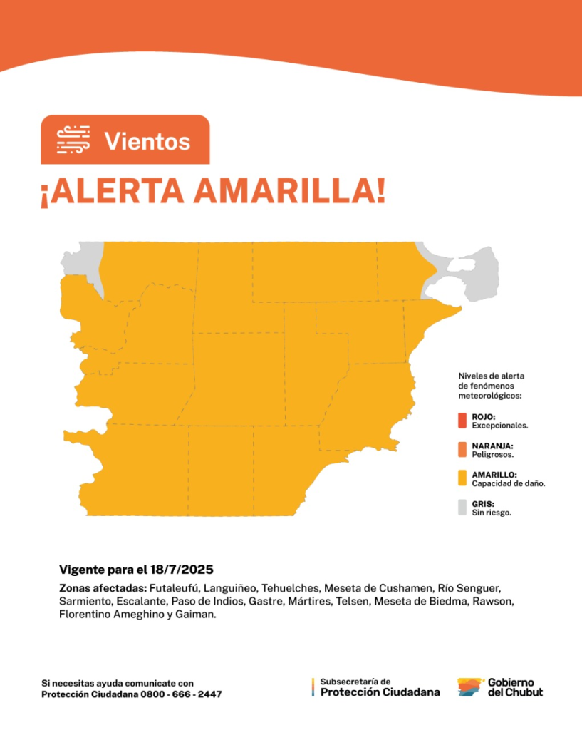 Según el parte oficial, las zonas que se verán afectadas incluyen los departamentos Futaleufú, Languiñeo, Tehuelches, Meseta de Cushamen, Río Senguer, Sarmiento, Escalante, Paso de Indios, Gastre, Mártires, Telsen, Meseta de Biedma, Rawson, Florentino Ameghino y Gaiman.