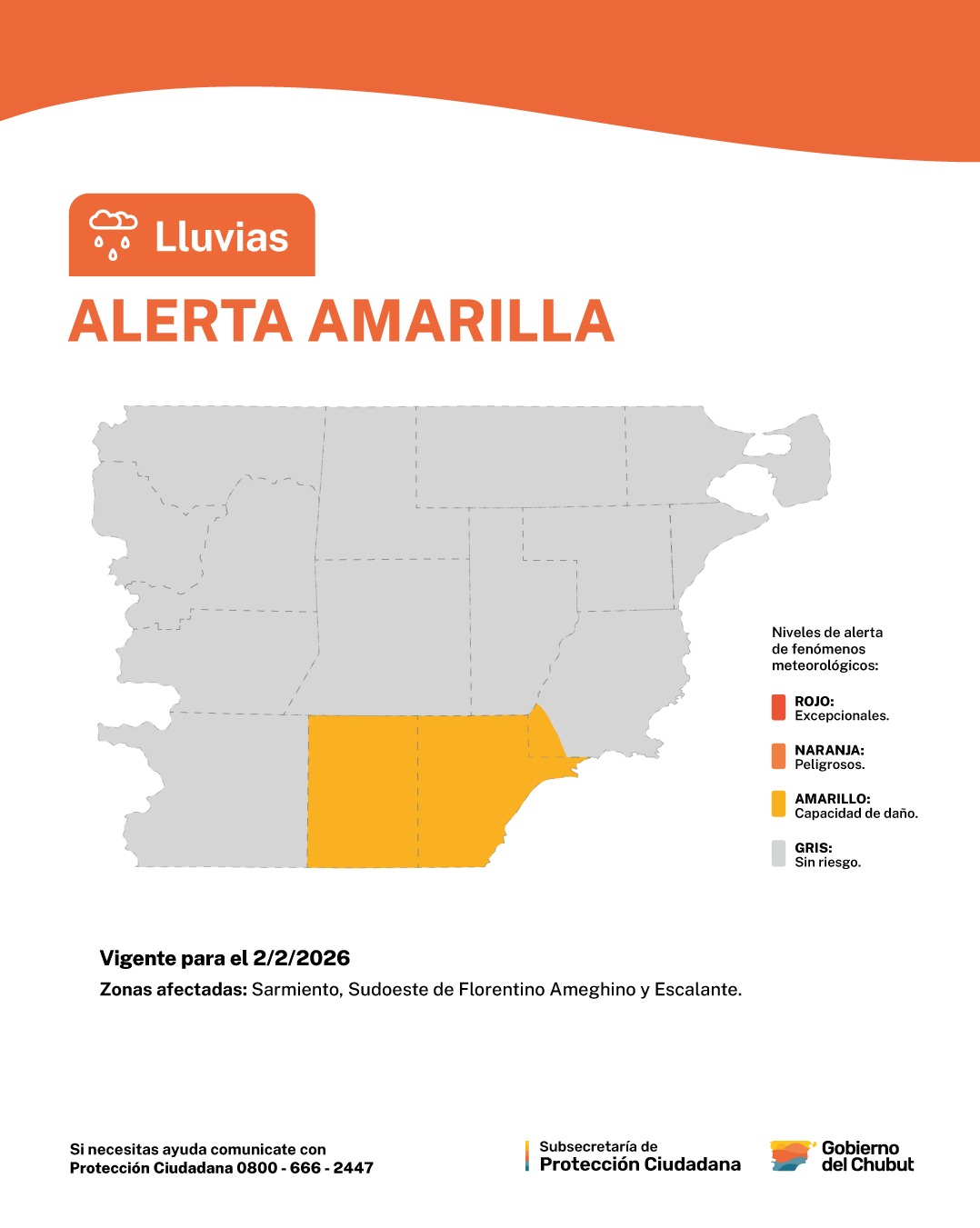 La Subsecretaría de Protección Ciudadana del Gobierno del Chubut, en base a información del Servicio Meteorológico Nacional (SMN), comunicó que se encuentra vigente una alerta amarilla por lluvias para la jornada de mañana, lunes 2 de febrero de 2026.