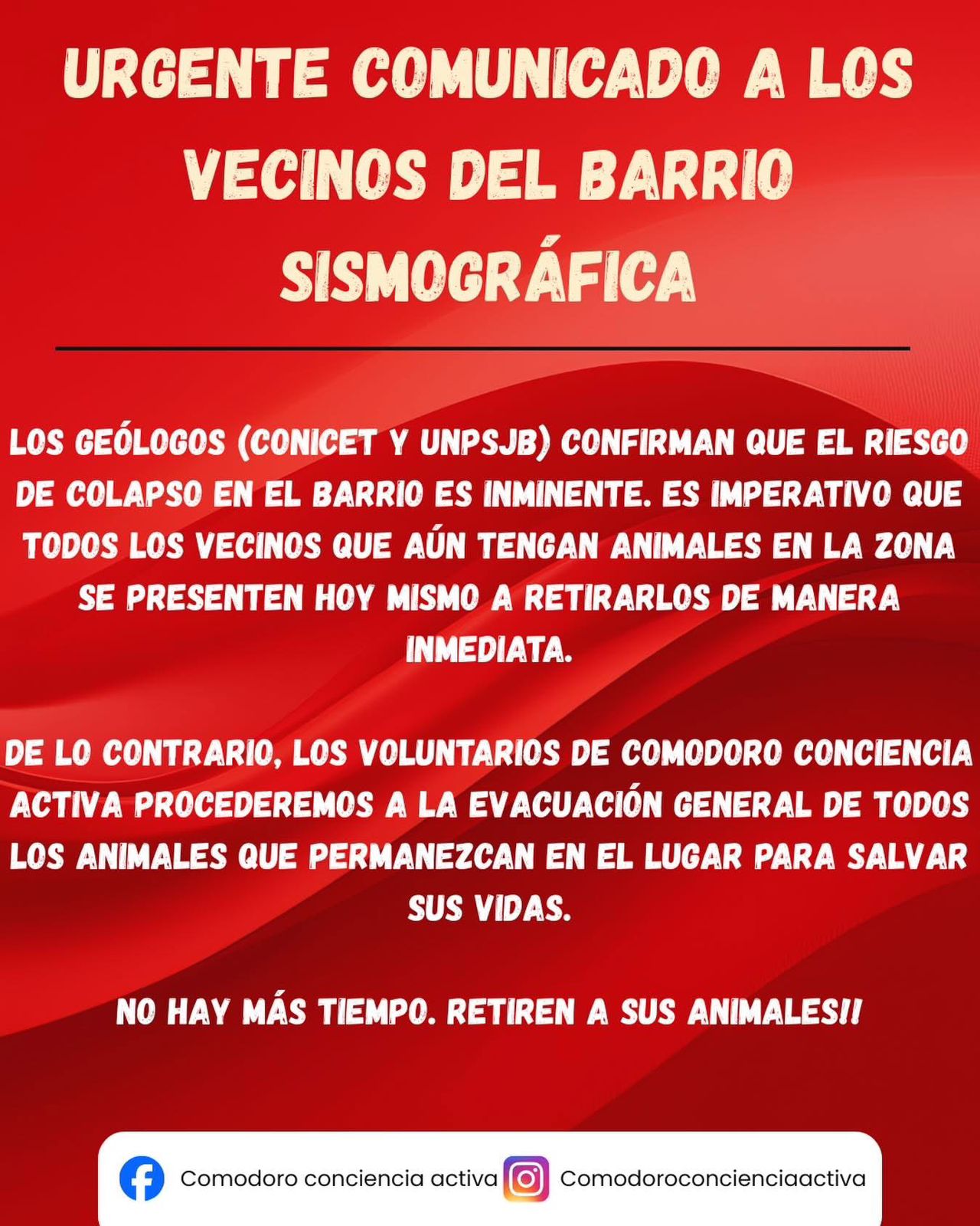 Ante el grave escenario que atraviesa el barrio Sismográfica, la organización Comodoro Conciencia Activa emitió un comunicado urgente dirigido a los vecinos de la zona, luego de que geólogos del CONICET y la Universidad Nacional de la Patagonia San Juan Bosco (UNPSJB) confirmaran que el riesgo de colapso es inminente.