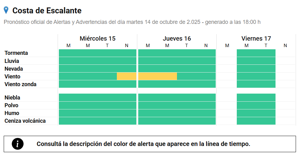 Por otra parte, para el miércoles se prevé una mínima de 12 grados y máxima de 18°, con cielo mayormente nublado y probabilidades mínimas de precipitaciones.