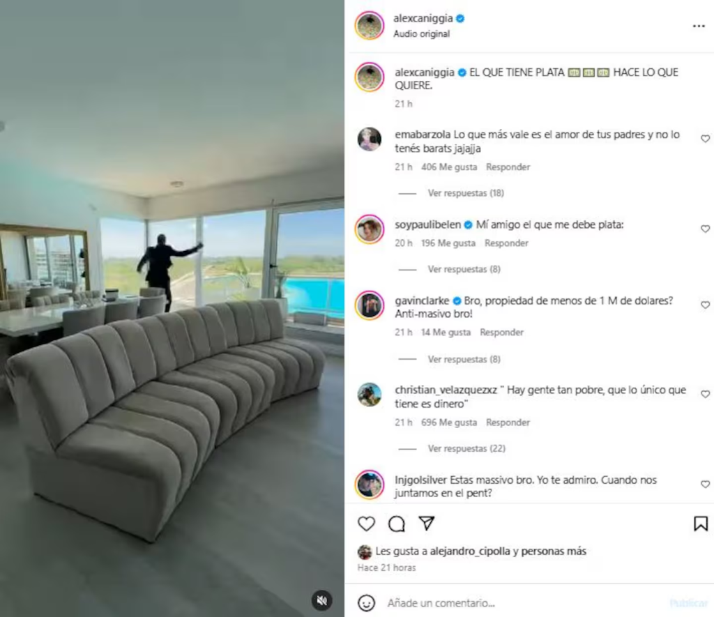 El hijo de Mariana Nannis y el Pájaro Caniggia publicó un reel donde se lo ve bailando en su propiedad. “Porque el que tiene plata hace lo que quiere. Mirá a dónde estoy, en mi pinche penthouse. Ladies and gentlemen, 368 mil dólares”, lanzó.