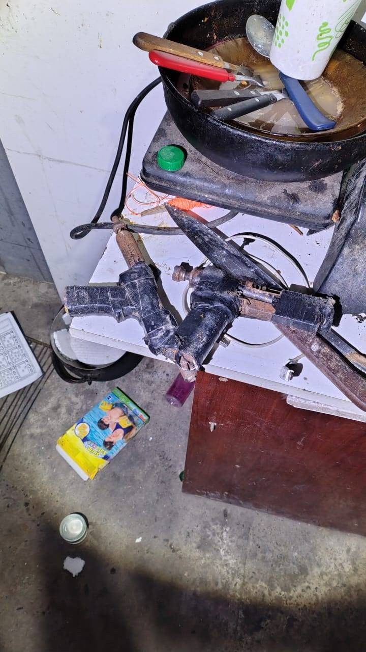 Allí, a un costado de un canal de desagüe que cruza de lado a lado la ciudad –entre las calles Nahuelpán y Colon—se efectuaron los procedimientos que terminaron con el secuestro de varias armas, entre ellas cuatro de fabricación casera (tumberas), una caja con municiones de grueso calibre y de un par de esposas que podrían ser robadas a un empleado policial.