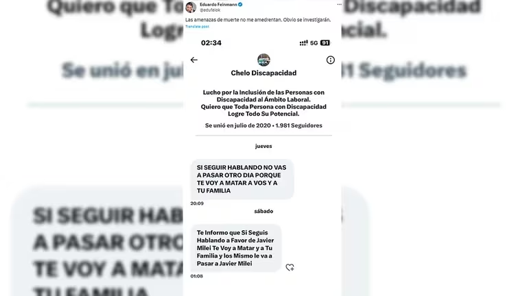 De acuerdo a la presentación, el acto intimidatorio fue concretado por primera vez el jueves 21 de diciembre, alrededor de las 20.09, cuando el usuario de X “Chelo Discapacidad” envió a la cuenta personal de Eduardo Feinmann el siguiente texto: “Si seguir hablando no vas a pasar otro día te voy a matar a vos y a tu familia (sic)”.