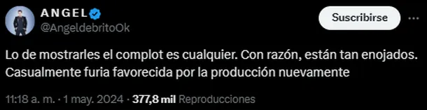 Uno de los que opinó esto último fue Ángel de Brito, quien usó su cuenta personal para fustigar a quienes dirigen el reality show de Telefe: «Lo de mostrarles el complot es cualquiera. Con razón, están tan enojados», comenzó indicando.