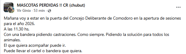 Protección Virginia Paredes anunció que este martes, a las 11:30, un grupo de animalistas se concentrará frente al Concejo Deliberante durante el inicio de sesiones para exigir castraciones.