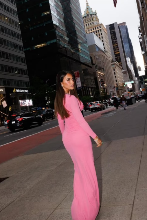 En el evento neoyorquino, epicentro de la moda mundial, Roccuzzo eligió un vestido ajustado al cuerpo, de mangas largas y con un pronunciado escote en V, donde pequeños pliegues en el torso aportaron dinamismo a la silueta. La elección del rosa intenso no solo reafirmó su conexión con la estética Barbiecore —que resignifica el color como símbolo de fuerza y sofisticación— sino que también rindió un sutil homenaje a los colores del equipo de su esposo.