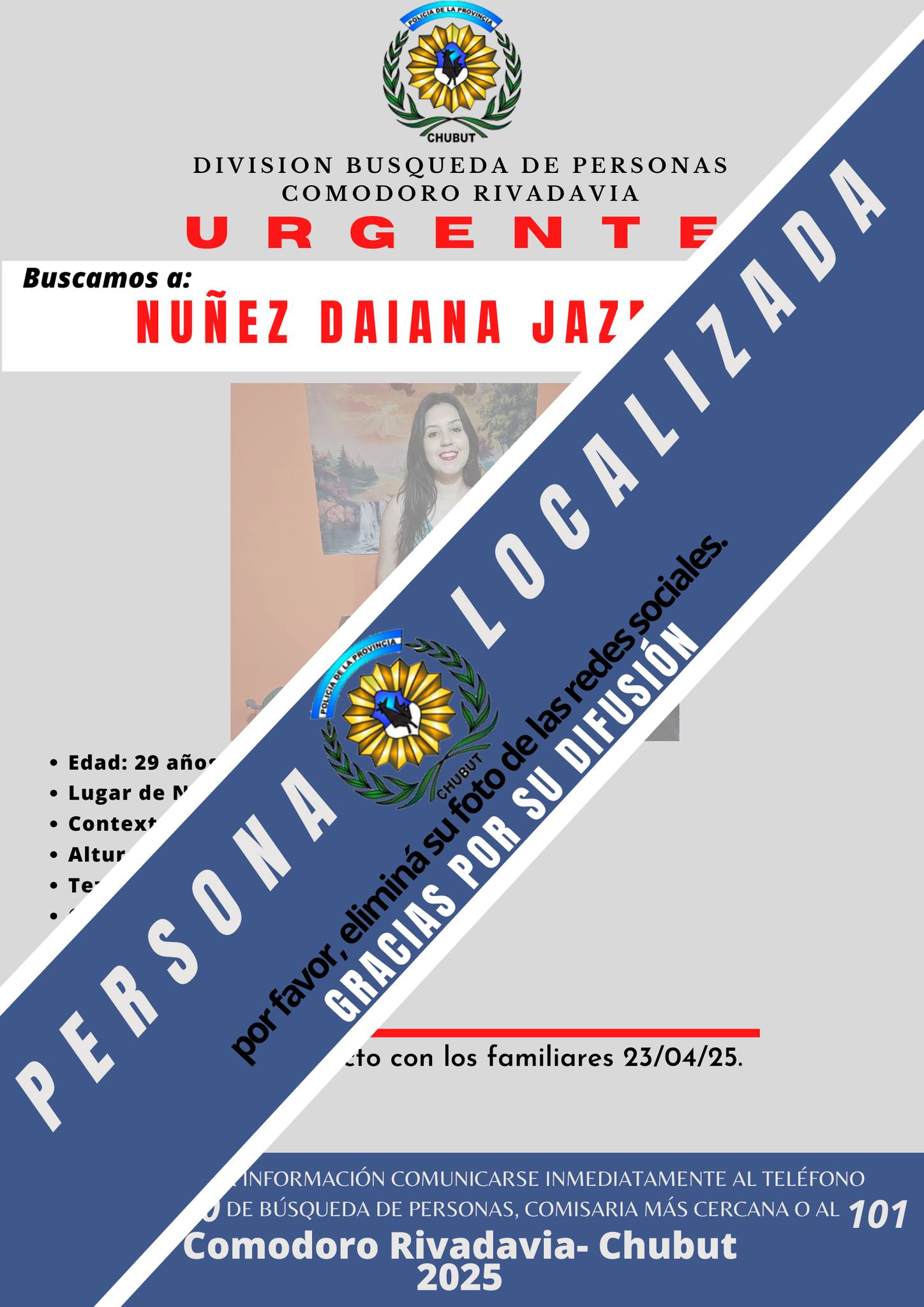 Este sábado, la División de Búsqueda de Personas de Comodoro Rivadavia informó a través de su página oficial de Facebook que Daiana Jazmín Núñez fue localizada. La joven, cuya desaparición había generado preocupación en la comunidad, fue hallada en buen estado, según detallaron las autoridades.