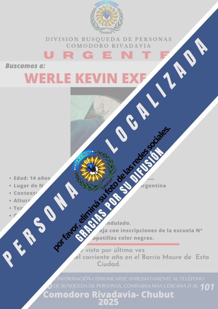 Durante la tarde de este miércoles, fuentes policiales confirmaron que Kevin Exequiel Werle, de 14 años, quien era intensamente buscado, fue encontrado en buen estado de salud.