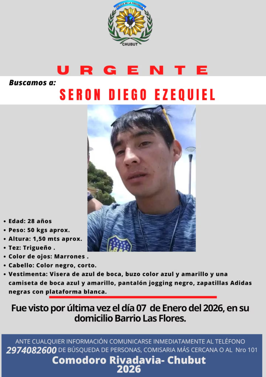 Ante cualquier información que pueda ayudar a dar con su paradero, se solicita comunicarse de manera inmediata al teléfono 297 4082600 (Búsqueda de Personas), a la comisaría más cercana o al 101.