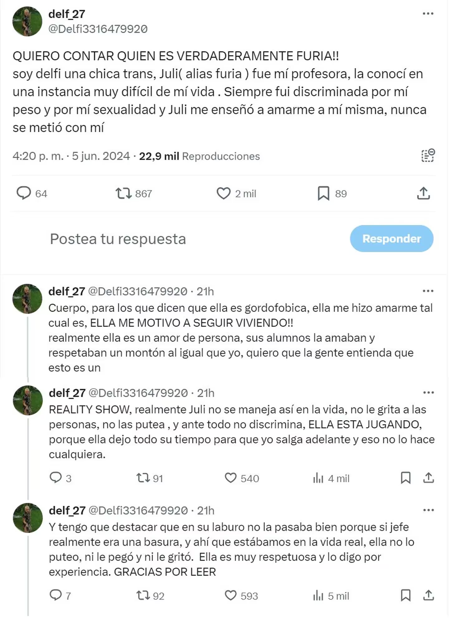 La chica, que se llama Delfi, expuso que en la vida real Juliana Scaglione no es como en el reality. “Fue mi profesora, la conocí en una instancia muy difícil de mi vida. Siempre fui discriminada por mi peso y por mi sexualidad y Juli me enseñó a amarme a mí misma, nunca se metió con mi cuerpo. Ella me motivó a seguir viviendo”, aseguró en X (Twitter).