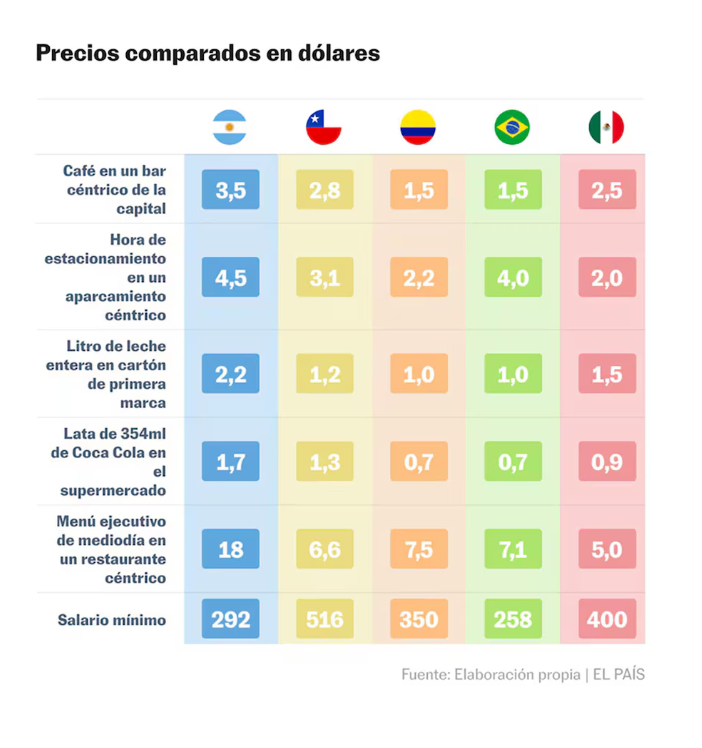 En medio del debate por la apreciación cambiaria, Argentina se convirtió en el país con el café más caro de la región. Pero no es el único producto, ya que también se encuentra el litro de leche y la hora de estacionamiento. Al mismo tiempo, el salario mínimo es uno de los más bajos.