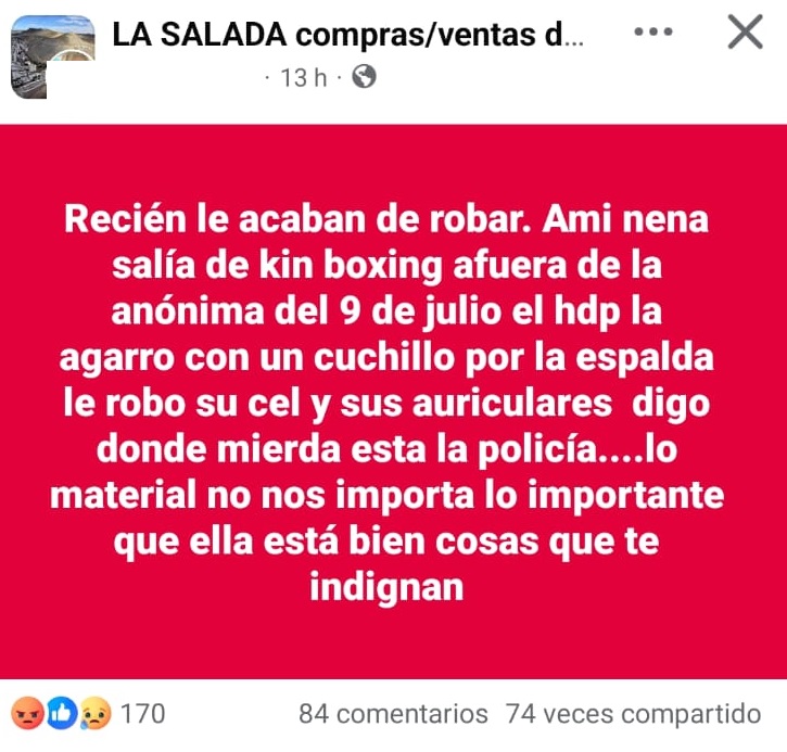Una adolescente de 15 años fue asaltada anoche cerca de La Anónima de 9 de Julio, a eso de las 22:40 horas, mientras salía de su entrenamiento de kickboxing en el gimnasio Team Mellado.