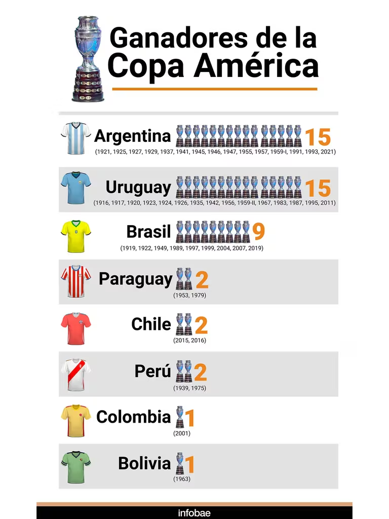 Uruguay (19): 2 Mundiales, 2 Juegos Olímpicos y 15 Copas América
