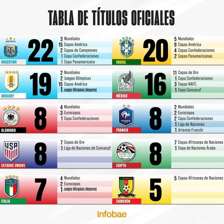 Argentina (22): 3 Mundiales, 15 Copas América, 2 Copas de Campeones, 1 Copa Confederaciones y 1 Copa Panamericana