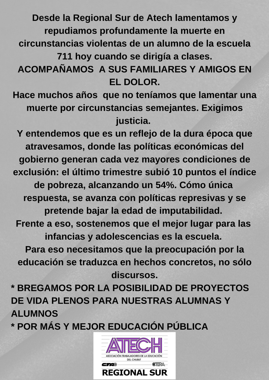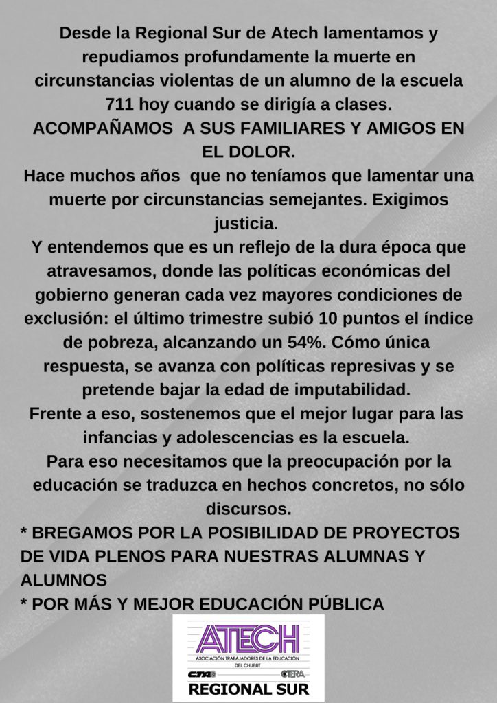 En este sentido, señalaron que “sabemos que es una mañana complicada y triste, hace muchos años no lamentábamos una situación como la que le pasó al alumno de la Escuela N° 711”.