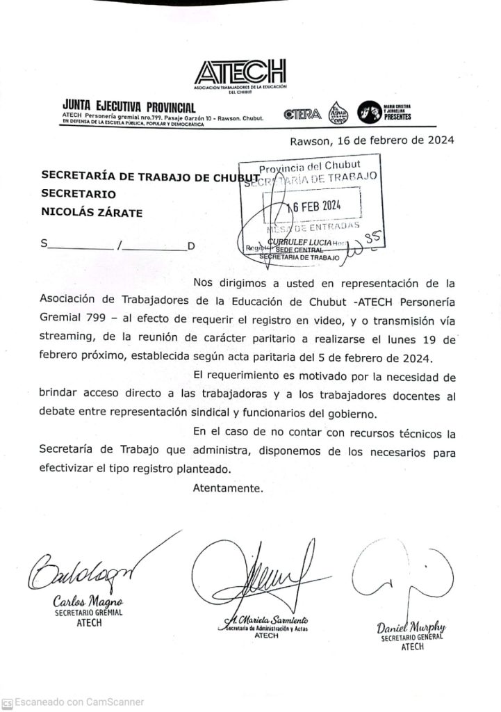 La Asociación de Trabajadores de la Educación del Chubut (ATECh) le envió una nota a la Secretaría de Trabajo solicitando la transmisión online de la reunión paritaria que se desarrollara el próximo lunes 19 de febrero.