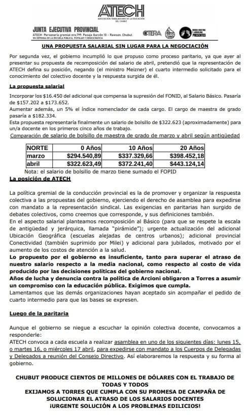 La Asociación Trabajadores de la Educación de Chubut (ATECh) anunció el rechazo de la propuesta de Provincia en la paritaria llevada a cabo este jueves en Rawson.