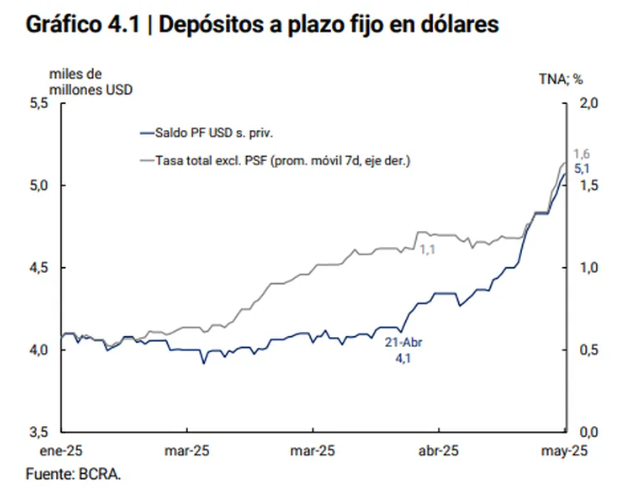 En un contexto de incertidumbre cambiaria y pocas alternativas seguras para dolarizar los ahorros, los plazos fijos en dólares volvieron a ganar protagonismo entre los inversores argentinos. Según datos oficiales, al cierre de mayo el stock total de depósitos a plazo en moneda extranjera del sector privado alcanzó los u$s5.037 millones, lo que representa un incremento de más de u$s700 millones respecto a abril.