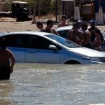 En la localidad de Las Grutas la marea tapó hasta el estacionamiento de un balneario y generó que varios vehículos terminen flotando en la inesperada pileta que inundó el lugar.