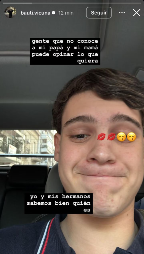 “Gente que no conoce a mi mamá y mi papá puede opinar lo que quiera. Yo y mis hermanos sabemos bien quién es quién”, disparó con una selfie sacada arriba de un auto, posiblemente conducido por la top model que aterrizó en Ezeiza hace pocas horas.