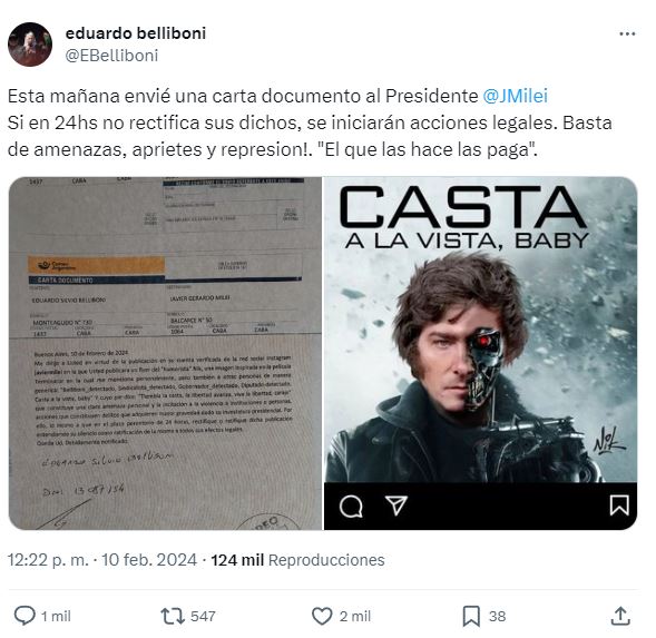“Me dirijo a usted en virtud de la publicación en su cuenta verificada de la red social Instagram, @javiermilei, en la que usted publicara un flyer del ‘humorista’ Nik, una imagen inspirada en la película Terminator, en la cual me menciona personalmente, pero también a otras personas de manera génerica”, indicó el piquetero de izquierda en el documento remitido a Balcarce 50, sede de la Casa Rosada.